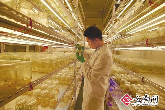 记者15日来到昆明阳宗海畔的云南纳博生物科技有限公司,走进一间简易暗室,眼睛适应几分钟后,就看到桌子上摆放的10多个组培瓶里,有植物发出微弱光亮。