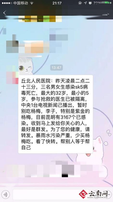 据介绍,网传的信息称,“昨天凌晨二点二十三分,三名男女生感染sk5病毒死亡,最大的32岁,最小的5岁,参与抢救的医生已被隔离,中央1台电视新闻己播岀,暂时别吃杨梅,李子,特别是紫金的杨梅,目前昆明有3167个已感染。”