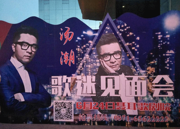 6月24日晚上,昆明聂耳歌剧院举办汤潮歌迷见面会,门口聚集了许多买票的歌迷。聂耳歌剧院昀所有工作人员,早已整齐的排队恭候陆续到来的歌迷。前来观看演出的歌迷有1000余人,还有许多家长带着孩子,到现场参加抽奖活动。参加抽奖活动的观众都有丰厚的礼品。歌迷见面会现场火爆,当知名歌星汤潮上台的时候,许多观众和他一起挥舞荧光棒唱歌互动。还有其他参加表演的歌星,小品演员,杂技表演者,大家都是很投入的用灵魂在表演。