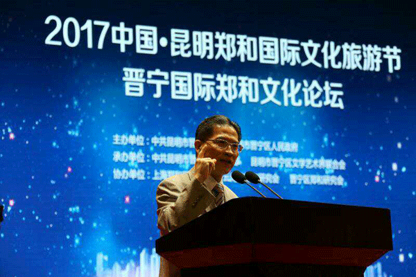 7月12日,2017中国·昆明郑和国际文化旅游节晋宁国际郑和文化论坛在晋宁区晋宁会堂举行。论坛由中共昆明市晋宁区委、昆明市晋宁区人民政府主办,中共昆明市晋宁区委宣传部、昆明市晋宁区文学艺术界联合会承办,上海郑和研究中心、云南省郑和研究会、晋宁区郑和研究会协办。以“一带一路”发展战略接轨晋宁城市现代化进程为主题,围绕“城市化视野下郑和文化塑造与创新”举行。应邀参加论坛的主要领导和专家教授有全国政协常委、民建中央副主席、上海市政协副主席周汉民教授;国家郑和研究会副会长、上海郑和研究中心主任时平教授;新加坡国际郑和学会会长陈达生博士;台湾中华郑和学会理事长赖进义先生;中国科学院胡长青研究员;中国回族学会会长、云南省郑和研究会会长高发元教授;云南省郑和研究会副会长、秘书长王子华教授;云南省郑和研究会副会长姚继德教授,晋宁区区长李福军等区级领导及福建漳平王景弘研究会副会长曹木旺先生、南京和晋宁郑和后裔,中央、省、市、区的新闻媒体朋友参加论坛。