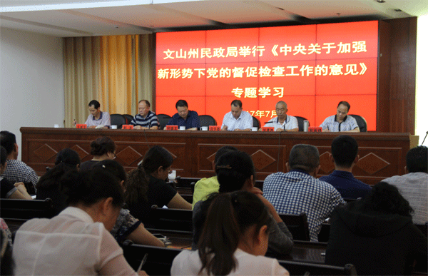 717,州民政局举行第5次干部理论集中学习,举行《中央关于加强新形势下党的督促检查工作的意见》专题学习,组织学习新华社宣传报道、《意见》要点解读、主要精神以及《深刻认识意见制定出台的重大意义》《积极构建督促检查工作大格局》《着力提高督促检查工作权威性和执行力》等内容。