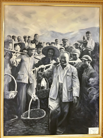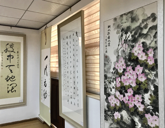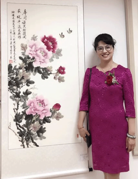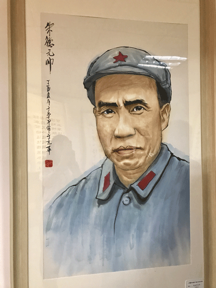 云南省第二监狱女警察曹晶萍女士的作品“国画牡丹”被选入“建军90周年,朱德与云南精品书画展”展出,入驻朱德旧居。图为曹晶萍女士在朱德旧居与自己的作品合影留念。