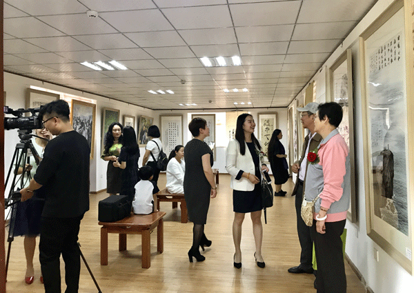 中国书画世界行云南委员会主席胡晓幸(左)和入选“朱德与云南”精品书画展国画牡丹的作者曹晶萍女士合影留念