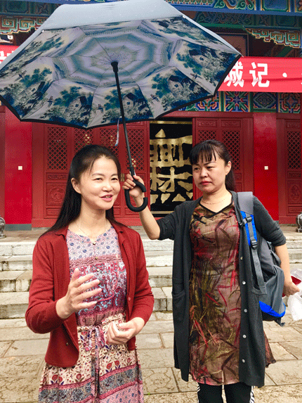 曲靖一中校长杨晶(左)正在讲解爨文化