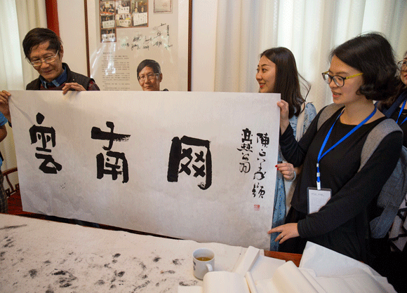 云南网的记者珍藏陈正义老师現场题写赠送的书法“云南网”,激动万分地与陈老师合影留念