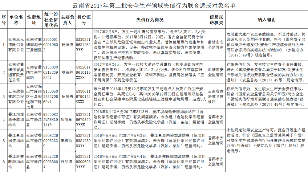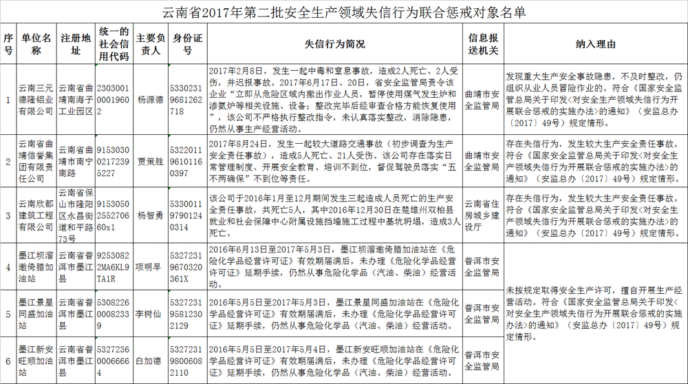 根据《国家安全监管总局关于印发<对安全生产领域失信行为开展联合惩戒的实施办法>的通知》(安监总办〔201749号)有关规定,经审核,将云南三元德隆铝业有限公司等6家生产经营单位及其有关人员纳入联合惩戒和“黑名单”管理,管理期限为本通告发布之日起1年。