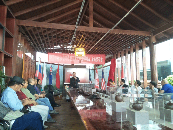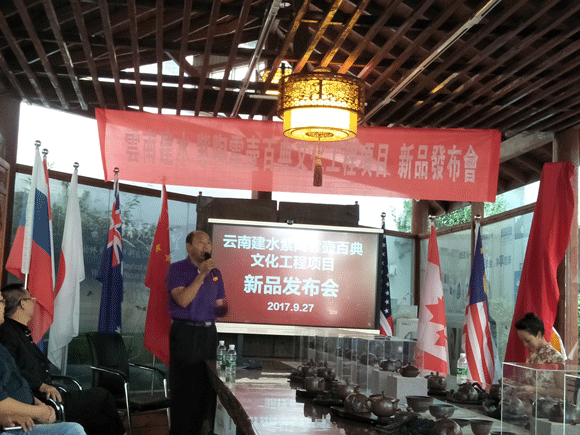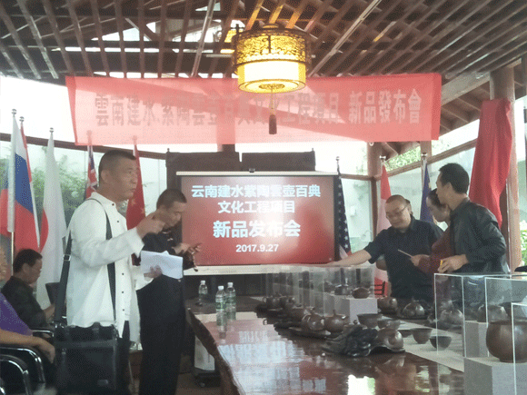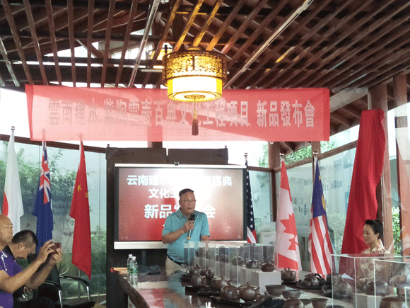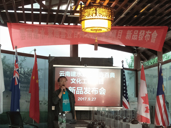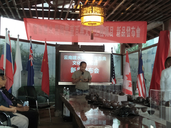 苏博士给参会人员讲解“云壶百典工程项目”;为了强化”建水.紫陶”与云南茶叶的天然联系,向世人明确紫陶茶具云南属性,特创制出与本土茶品最为匹配的茶壶器具,从而更好的发展和丰富云南的茶文化。为此,云南省工艺美术行业公会特别成立”云南建水.紫陶云壶百典文化工程项目部”并委派会员单位云南南孟茶业有限公司云览子设计团队和汤猛陶艺工作室进行初期的具体组织设计及制作,出品有内涵与特色的新紫陶云壶。并在后续中不断邀请更多的陶艺大师和陶企业加入,一起推动这紫陶云壶的原创工程,让紫陶云壶传播云南的文化。
