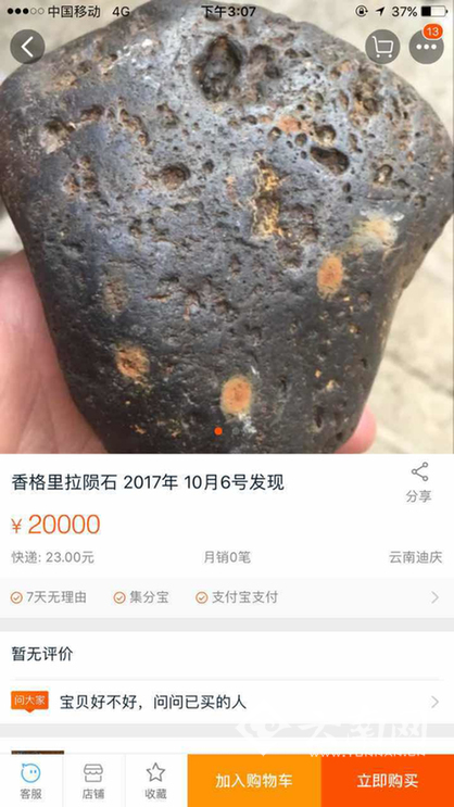 10日下午,一张网购平台上正出售“香格里拉陨石”的截图在网络流传。随后,云南网(微信公号:yunnancn)以“香格里拉陨石”为关键词在淘宝上搜索,发现确有一店铺在出售一款名为“香格里拉陨石,2017年10月6号发现”的商品信息,其标价从8000元到20000元不等,地址为云南迪庆,月销售0。商品图片为一块约手掌大小的黑色石块,石块表面有很多大小不一的细孔,商品介绍称这石块是香格里拉火星陨石,还标出“喜欢的就随缘,量少不等人”的信息。