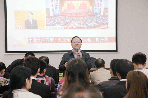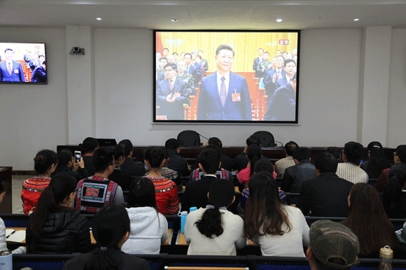 10月18日上午,在文山学院的会议室、教师办公室、教室、宿舍、食堂,全校师生相约聚集在一起收听收看党的十九大召开盛况。大家秩序井然,聚精会神,不少师生边看边记录,不时为十九大的报告所打动,所鼓舞。