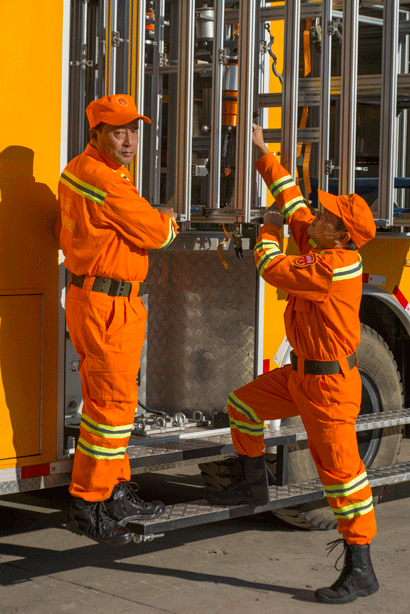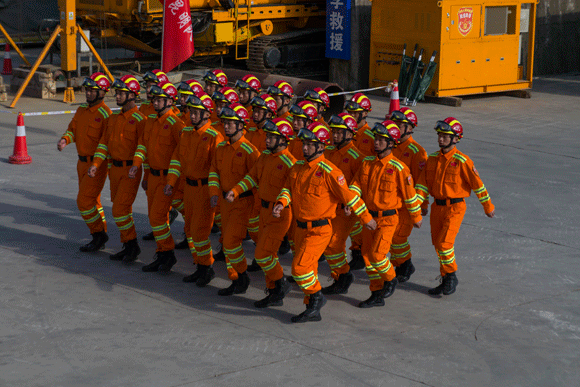 10点,中铁二局昆明救援队战训部部长王维俊拉响警报铃,现场演练队员闻警集合,钻机中队中队长田太波跑步至主席台前敬礼,“报告队长,队列演示完毕,请指示”。