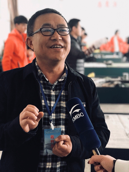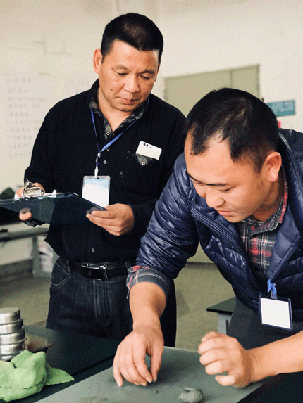 云南省勘察设计质量协会土工专委会主任 李育红正在给决赛“塑限搓条法”的选手周忠国打分