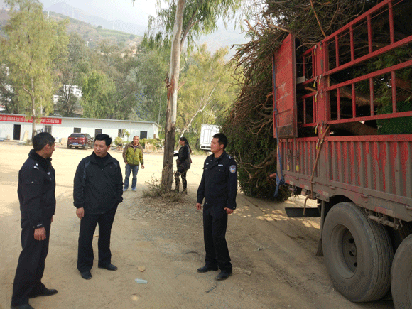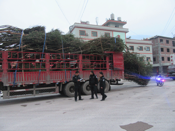 1227日凌晨415分,巧家县森林公安局接到匿名电话报警称:巧家县过境公路上有一辆红色挂车拉了一车木材,开往蒙姑方向,请你们调查处理。接警后,该局立即打电话到蒙姑交警检查站,请求帮忙拦截运输木材车辆,并迅速组织民警赶往现场开展调查工作。