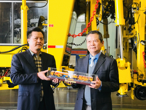 中国铁建高新装备股份有限公司党委书记赵晖(左)向中国机械设备工程股份有限公司第六成套事业部总经理尹志新(右)赠送大型养路机械模型