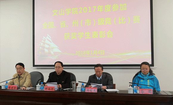 为彰显学生立志成才、刻苦学习、勇于实践、奋发进取、全面发展的良好风貌,充分发挥先进典型的示范引领作用,积极营造创先争优、催人奋进的良好育人环境,1月4日,文山学院2017年度参加全国、省、州(市)级竞(比)赛获奖学生表彰会在文贤楼201会议室隆重举行。校长郝南明、党委副书记冯林虎、张晓憬、副校长谷雨出席表彰会,与获奖学生代表、指导教师代表、各二级学院和相关职能部门负责人欢聚一堂,数点一年来所取得的成绩,分享心得和经验,共话未来和发展。党委副书记张晓憬同志主持表彰会。