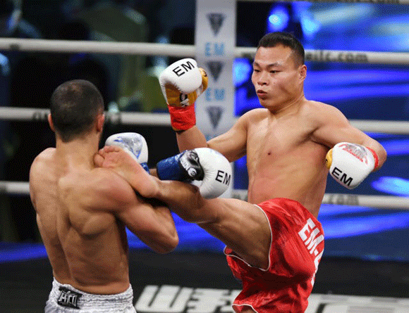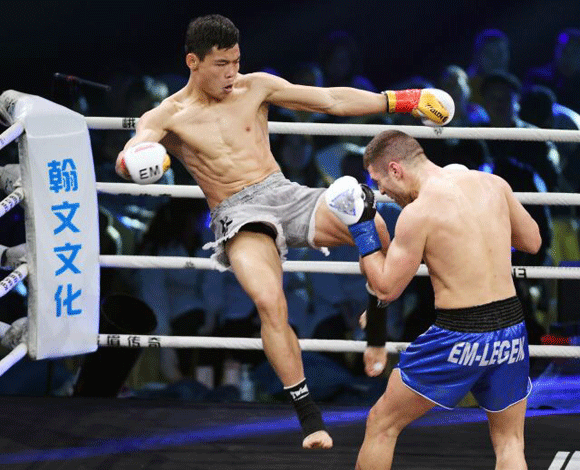 在自由搏击71KG超级赛中,中国选手韩飞龙(左)战胜罗马里亚选手米利亚。(新华社记者 杨宗友摄)