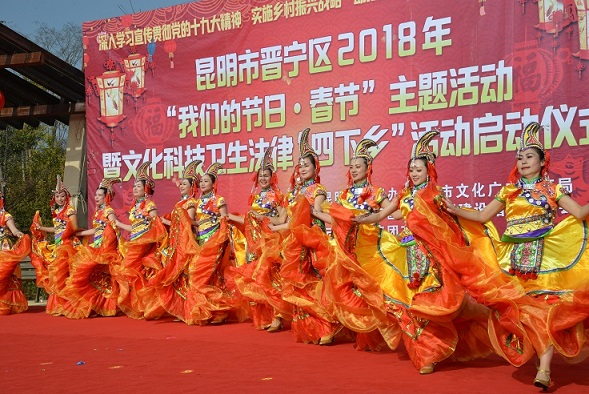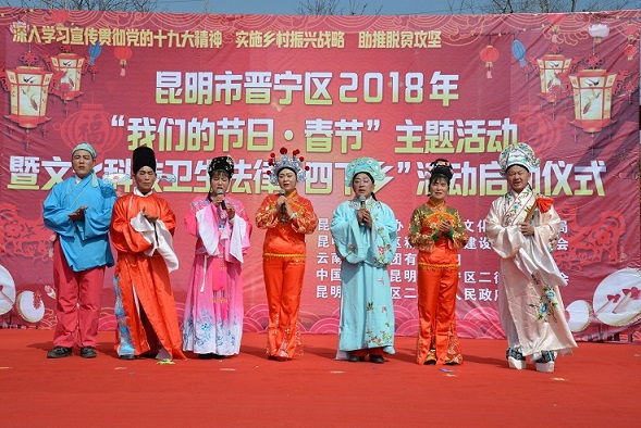 2018年晋宁“四下乡”活动以“深入学习宣传贯彻党的十九大精神 实施乡村振兴战略 助推脱贫攻坚”为主题,宣传部、司法局、法院、检察院、公安局、经贸局、国税局、地税局、国土局、规划局、住建局、市场监督管理局、环保局、农业局、林业局、卫生局、科信局、民政局、工商联、区总工会、区妇联、团区委、区科协、区供销社、云南省女子监狱、城市管理局、文体旅游局、云磷集团等20余家单位在启动仪式上开展了文化科技卫生法律集中示范活动。各单位通过分发宣传单、宣传册、赠阅书籍、现场答疑、新型农业产品展示、义诊等方式,为农民群众送去科普、法律、政策法规、卫生保健、农业种养殖等各方面知识,还有来自云磷集团和二街镇本土的的文艺团体现场搭台,为乡亲们送上了一场精彩的文艺演出和春节祝福。