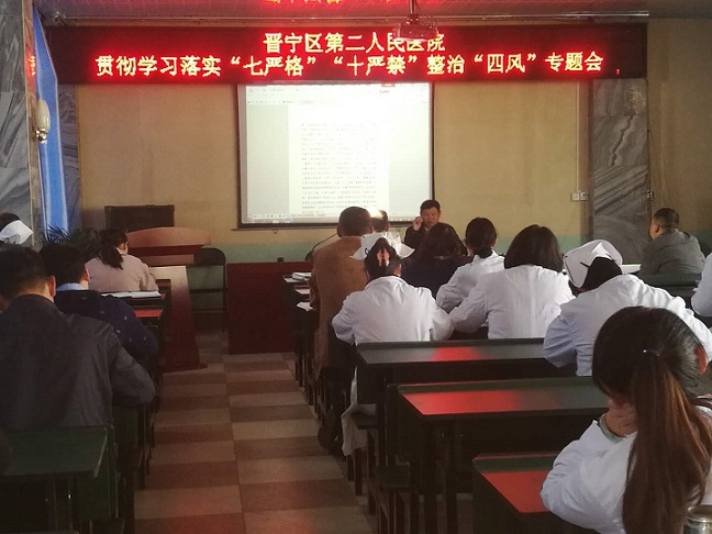 为使全院党员、干部、及全院职工充分认识“四风”问题的顽固性、反复性,认真落实作风建设主体责任,加强对所有党员干部的教育、监督和管理,让医院党员干部率先垂范,自觉遵守纪律规定。2018年2月12日下午,医院党支部在医院门诊五楼会议室,召开“晋宁区第二人民医院贯彻落实学习“七严格”“十严禁”整治“四风”专题会”,会议由宋宏伟书记主持。