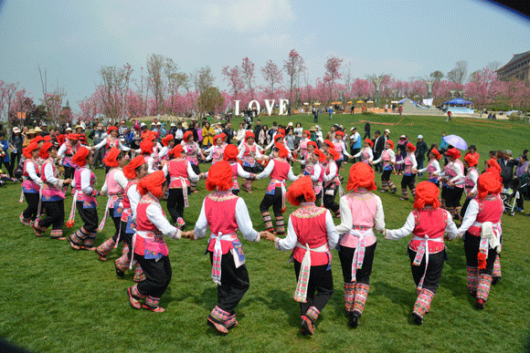 “咚咚咚……”一组身着彝族服装的队伍吸引了游客的眼球,这是清一色的女子秧佬鼓队,她们个个头戴红头巾、带上腰鼓,一手持白手巾,一手持彩色羽毛,边挥舞,边击鼓,随着时而激烈、时而缓慢的鼓点节奏,她们也随之或飞舞旋转、或轻轻踏步。这富有民族风情的表演吸引了游客,纷纷拿出手机拍照留念。据悉,这是来自晋宁双河彝族乡的农民秧佬鼓表演队, 2005年晋宁“双河彝族秧佬鼓舞之乡”被列为云南省首批非物质文化遗产保护名录,成为了晋宁民族传统文化的重要代表。近年来,晋宁县的秧佬鼓队伍得到了空前发展,全县城乡秧佬鼓队伍达300多支,秧佬鼓舞已成为广大群众喜闻乐见的一种民间传统舞蹈。
