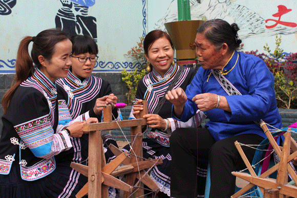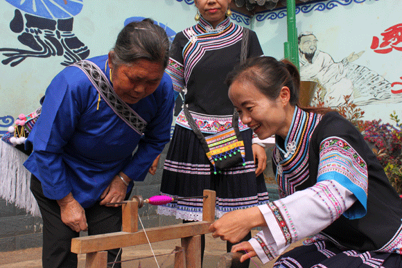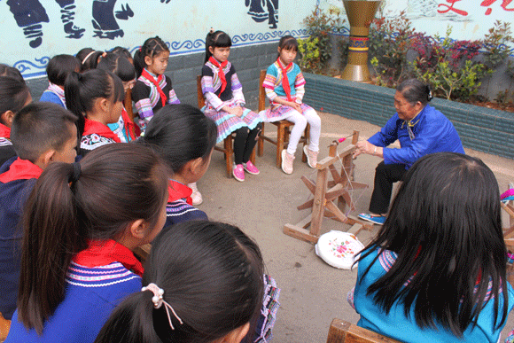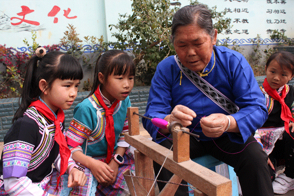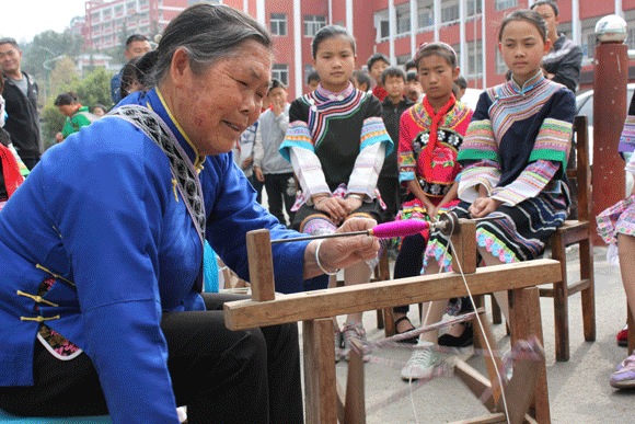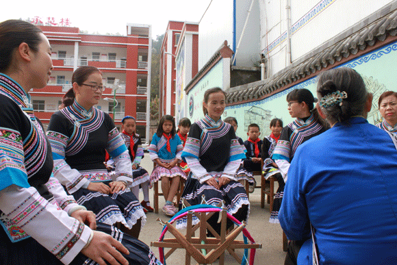 “布依有好酒、布依有好茶……”优美动听的布依歌声伴随“啪啪啪”的纺织声在罗平长底布依族乡完小操场响起。学校的操场上一群身着布依族服装的学生和老师聚精会神地学习布依纺织技术。这是学校在抓好基础学科教育的同时,注重将学校教育和布依民族文化教育相结合,有针对将布依民族纺织文化引入课堂、进校园的一个缩影。