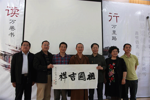 交流最后,樊端然教授向大家展示了自己近期的部分书法作品,一些听众向樊端然教授现场请教书法练习等问题,他作了十分细致的解答。交流结束后,樊端然教授应邀为彩云读书会题字“祖国吉祥”,作品笔力沉雄,展露出阳刚豪放、酣畅淋漓的笔墨气韵。读书会听众向樊端然教授献花并争相合影留念。