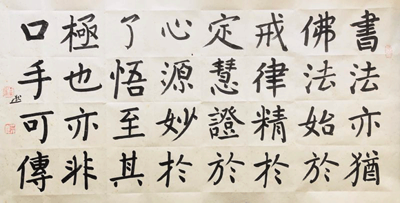 有一种说法很有道理,说是要看一个书法家的传承,顶好是看他的楷书。这个集子里,樊端然收入了他的三幅楷书:刘禹锡《陋室铭》、范仲淹《严先生祠堂记》、苏轼《赤壁赋》。虽然从这些一笔不苟的楷书作品中,我们可以看得到多位书法大师的意趣,但是从字的点画、结构,我们却又很容易地看出樊端然颜体的基本功底来。而且再仔细一点,我们还可以从三幅字中,进一步辨识出钱南园的“坚卓生动”和陈荣昌的“爽劲疏秀”。钱南园和陈荣昌都是云南人,书法界一般把钱南园看成是颜真卿书体的继承者,而把陈荣昌看成是钱南园书体的继承者,但是这种承袭不是一种简单的再现,比如在樊端然书写的《赤壁赋》这轴三米长卷中,我们所欣赏到的江上清风,山间明月那样的意境,它是通过刚韧劲美的笔意和疏朗灵动的行款布局创造出来的,具有樊端然独特的书法个性。