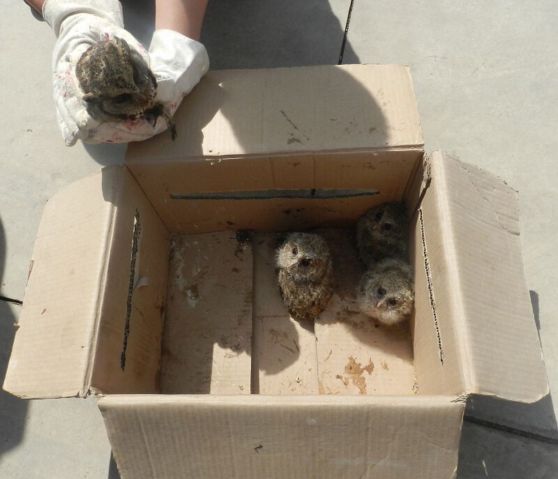 接警后,该局民警立即赶往妥睦村,在一建筑工地的沙堆里,看见一只成年猫头鹰和三只猫头鹰幼仔。据救助者称,建筑工地刚开始施工的时候就在沙堆里发现了几枚鸟蛋,工人们尽量避开沙堆作业,希望不影响鸟儿生存繁衍,但是今天需要搬运沙堆,发现这几枚鸟蛋已经孵化,是三只猫头鹰幼仔,而且还有一只成年猫头鹰在一旁照顾,所以立即向森林公安局求助。民警当场对照野生保护动物图谱辩认,初步确认其属国家二级保护动物。由于雏鸟野外生存能力不强,不宜放生,故民警小心的把四只猫头鹰带回局里妥善安置,并及时将其送到云南省野生动物收容拯救中心进行救助。