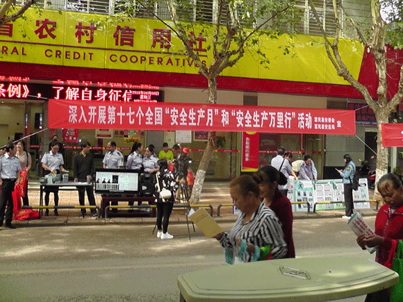 6月6日,富民县开展第十七个“安全生产月”和“安全生产万里行”咨询日活动。活动紧紧围绕“生命至上、安全发展”这一主题,牢固树立“红线意识”和“底线思维”,县安委办牵头组织县安全监管局、县交警大队、县消防大队、县林业局、县城管局、县文体广电旅游局、县司法局、县总工会、县水务局、县农业局、县改革局、县人力资源和社会保障局、县防震减灾局、县住建局、县国土局、县环保局、县市场监管局、气象局、县卫计局、县运管局、县科工局、永定街道办等单位部门开展咨询日活动。