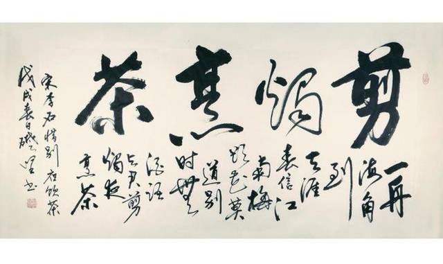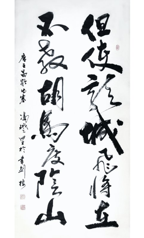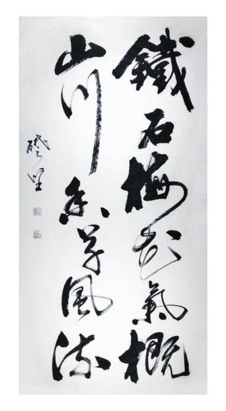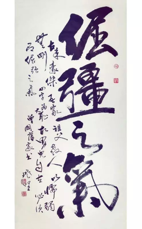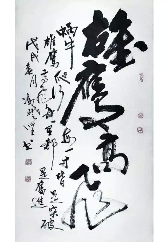 他还认为书法要表现一个书家的情趣、思想、个性,以及反映出自己的文化内涵、艺术修养。书法要与时俱进,绝不能一味的追求古意,要体现新时代的风貌和自己的特质。所以在书写中,他不刻意法度的追求,不在乎点画的优美均衡,强调笔势字型的起伏粗细变化及顿挫抑扬之意,以自己深厚的武术功力与才气入书。掌握住力量与平衡、速度与节奏,起笔前运气于身,落笔时力透纸背、截铁断金。