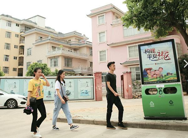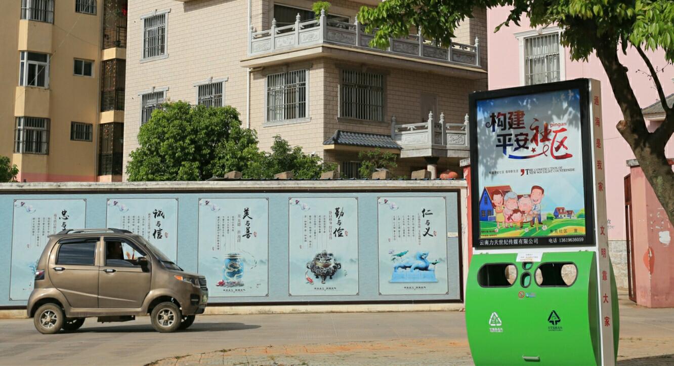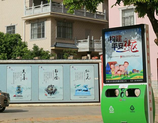 在东苑社区,融合了“低碳环保、绿色生活”概念的太阳能保洁箱均被放置在道路交叉口或人流量相对较大的显眼位置,灯箱上还配套了“社会主义核心价值观”“文明城市创建”“平安社区”等精神文明建设相关内容,不约而同地和社区建设的“文化墙”形成立体多层次的文明新风的宣传“阵地”,在润物细无声中传递精神文明新风尚。