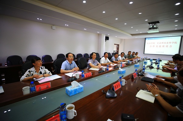 座谈会上,郝南明校长向来宾介绍了文山学院办学历史、五大功能、硬件设施、科研条件和合作优势,本着资源共享、优势互补、协同创新共同促进双方发展的原则,郝校长就双方今后的合作提了四点建议:1.联合开展服务地方经济社会发展的应用型研究;2.依托双方优势,构建项目平台,联合组建地方特色人才培养的教学团队;3.建立双方大型科研仪器共享机制;4.联合共建文山农业科技成果转化服务中心,为文山农业科技成果转化、企业自主创新、产学研合作提供服务。