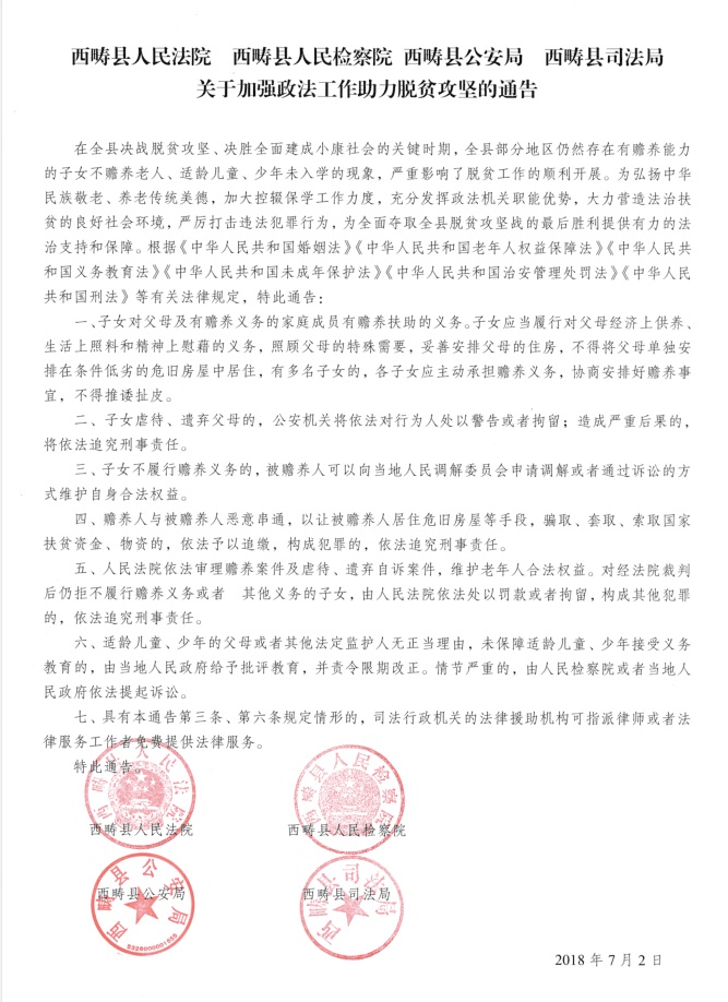 近期以来,西畴县开展脱贫攻坚工作中,发现部分农村地区存在子女居住于宽敞明亮的安全住房,而让自己的父母等长辈居住在黑、脏、乱、差等条件简陋的危旧房中,老人生活起居无人照料及未尽抚养义务、未保障适龄儿童和少年接受义务教育的现象存在。 针对这些不赡养老年人等虐待遗弃家庭成员,不供养适龄儿童和少年接受义务教育的行为,西畴县公检法司四部门联合发出通告,要求目前被赡养人依旧居住危旧房的,赡养人必须将被赡养人接入安全住房居住生活,并尊重被赡养人的生活习惯,处理好家庭成员关系,确保老人住得安稳、生活舒心,确因老人旧家难舍,故土难离,子女须保证在其原居住地有安全住房、衣食无忧。对于适龄儿童、少年,其父母或者其他法定监护人必须保障其受教育的权利。
