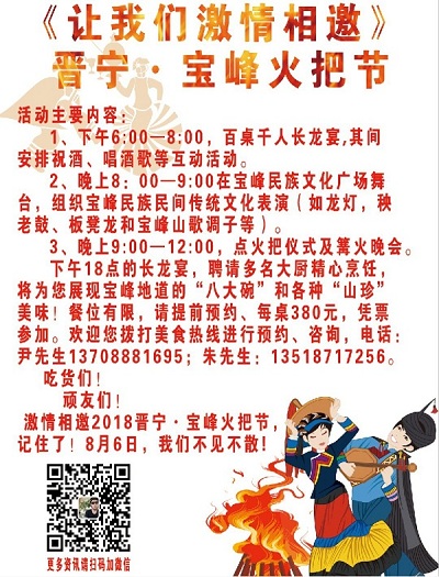 为响应党的十九大关于增强文化自信的号召,传承好宝峰彝族传统文化活动——“火把节”,进一步增强宝峰民俗特色文化品牌。昆明市晋宁区宝峰街道上方新街村委会,将于2018年8月6日在宝峰民族文化广场举办首届“狂欢火把节、打歌祝酒夜”篝火晚会。