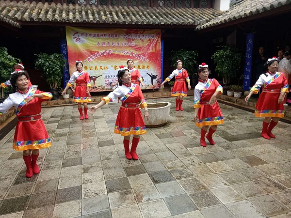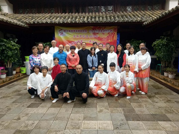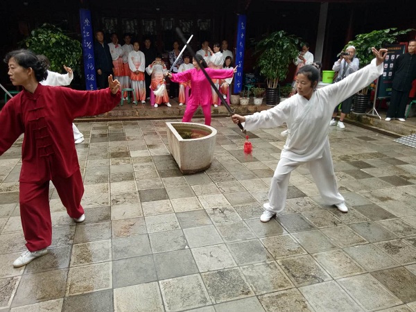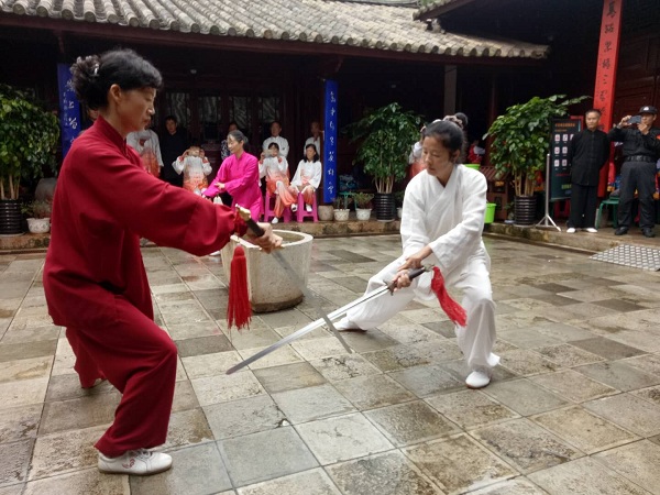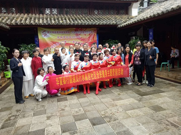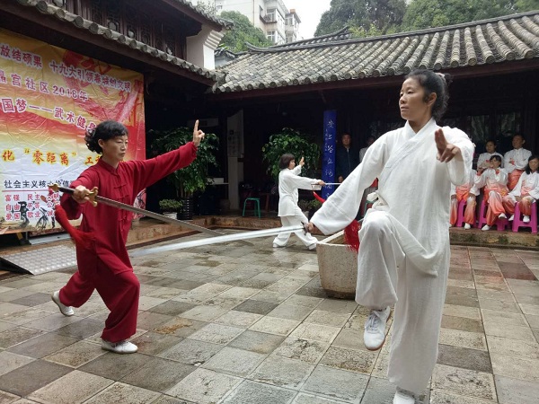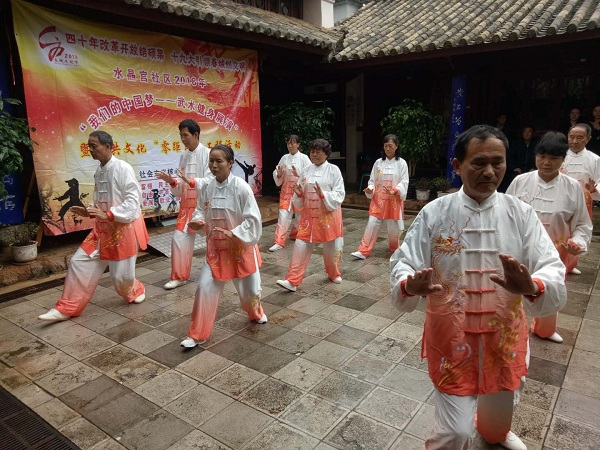 四十年改革开放结硕果,十九大引领春城创文明。水晶宫社区2018年“我们的中国梦一一武术健身展演”暨公共文化“零距离”工程活动在朱德旧居展开。为响应党和国家领导人向国人提倡全民健身运动,强身健体的号召,水晶宫社区邀请几家昆明文体社团表演节目,由云南武术知名人士周新翔全场主持,向东太极队由杨勇等人集体表演《武当太乙游龙拳》;主持人周新翔表演《太极杖》让人眼前一亮;开心艺术团集体表演健身舞《别哭吧宝贝》;进强中和武馆集体表演《八卦太极》;向东太极队由徐向东等人集体表演《沙式太极剑》;洪强队杨勇等人表演完《陈式太极拳》得到大家掌声欢迎。