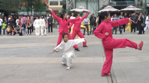 随后,主持人顾姣姣请出24式太极拳,由徐向东和杨勇等全体参演人员在音乐伴奏,主持人朗诵下表演完毕;沙国政武术馆由沙云凤带队表演;戳脚联合会唐宝平、李昆生、顾广昆三人表演戳脚让人眼前一亮!由我省知名武术人士何曙刚带队的蒋传吴峻山八卦掌研究会前后表演了12个节目;有八卦虎头钩、八卦剑、磨盘鞭杆、戳脚、双人八卦掌、八卦鸳鸯钺、八卦连环掌、八卦虎形掌、新八掌、直趟八卦掌、武当八卦剑等;来自龙兴武术队表演节目多达9个,有洪拳、少林棍、刀术、长拳、盾牌刀、双七首和九节鞭等,龙兴武术队的所有表演者都十分机灵,动作利索,让观众可喜的是,我们国家的武术后继有人!由龙形太极站向东太极队集体表演陈式太极拳给人印象深刻;进强向东太极队表演:游龙拳和太极八卦综合一起打;云南进强中和武馆小虎燕的表演充满青春朝气;王进强等人曾在省、市及国际武术赛事上夺过金摘过银奖;今天来自昆明南少林邹拳联谊会的陈斌、李坤、彭建生、杨跃祖四人的表演,把整个展演活动推向高潮,陈斌和李坤两人表演双人喷手,而彭建生和杨跃祖两人各打邹拳。他们动作熟练,一招一式,从驾人生,弘扬大爱!整个表演让人大饱眼福,在武术展演中,这种表演是一种创新模式!因为邹拳是我们武术界比较优秀的拳种之一,加上喷手,给练拳人刚强和坚韧,自强和不屈。宽容和大度,勤奋和执著。