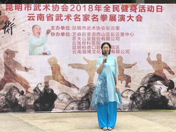 富有青春活力的主持人顾姣姣拿话筒,用标准含有磁性的普通话请出市武术协会主席陈丽华作简短发言后,陈主席宣布:云南武术名家名拳展演大会开始......