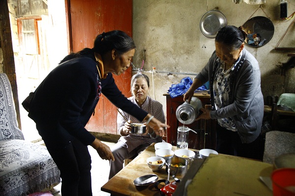 昆阳街道下方古城村,图为老人们来到家中为眼睛失明的老人送饭,还为她倒上了热水。