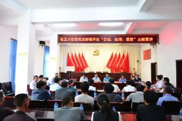 会上,省卫计委健康扶贫办调研员胡守敬作健康扶贫专题政策宣讲,帮助龙安干部群众进一步掌握健康扶贫政策,更好地享受健康扶贫政策红利。省卫生计生委机关党委专职副书记李克林作“自强、诚信、感恩”主题报告,介绍省卫生计生委近年来开展“挂包帮”定点扶贫情况,希望群众怀着感恩之心,自强发展,早日实现脱贫。省卫生计生委党组成员、保健局长、机关党委书记白松围绕“自强、诚信、感恩”主题及我委定点挂钩帮扶龙安镇有关工作作了重要讲话。白局长指出,我们要以习近平总书记新时期扶贫开发战略思想和党中央精准扶贫精准脱贫基本方略为指导,坚持精神与物质“双脱贫”,针对一些贫困乡镇、贫困群众存在的“等靠要”思想和安贫、守贫观念,采取多种形式,激发内生动力,教育引导贫困群众树立自强不息、诚实守信、脱贫光荣的思想观念和感恩意识,齐心协力打赢脱贫攻坚战。并就下一步工作提出三点要求:一是龙安镇村干部、省卫生计生委驻村扶贫工作队员要再接再厉,全力以赴投入脱贫攻坚工作中,继续强化精准施策,切实提高脱贫攻坚质量,继续做细、做实各项工作。二是要发挥群众的主体作用,变被动脱贫为主动脱贫,通过 “自强、诚信、感恩”主题实践活动,引导群众树立主体意识,激发内生动力。三是省卫生计生委要加大定点帮扶力度,多措并举,围绕“党建+扶贫”和健康扶贫30条措施等,积极协调项目资金,为群众办实事解难事,扎实推进我委“挂包帮”定点扶贫工作取得更多实效。最后,龙安镇党委书记陈钢作表态发言。