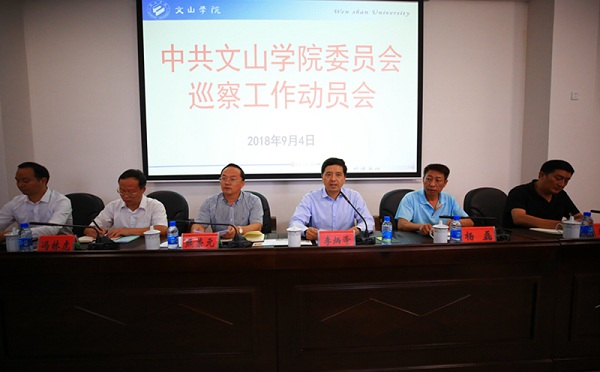 为认真贯彻落实省委高校工委、省教育厅全省省属高校巡察工作会议精神,依据《中国共产党巡视工作条例》、《中央巡视工作规划(2018-2022年)》、《中共云南省委贯彻〈中国共产党巡视工作条例〉实施办法》、省委高校工委《省属高校开展巡察工作的实施意见》、《中共文山学院委员会巡察工作实施办法》要求,全面启动巡察工作,2018年9月4日,文山学院在文贤楼201报告厅召开巡察工作动员会。党委书记熊荣元,党委副书记、校长李炳泽,党委副书记冯林虎,党委委员、副校长杨磊、吕昌会,党委委员、组织部长李洪潮及全校副科以上干部参会。李炳泽同志主持会议,熊荣元书记作动员讲话。
