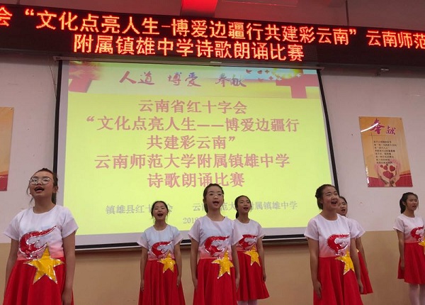 经过申报而获得省红十字会项目支持的镇雄县红十字会根据规定内容,与云南师范大学附属镇雄中学积极策划了以学生诗歌朗诵为引领,以百人应急救护知识培训、“探索人道法”现场教学、红十字青少年志愿服务等为主要内容开展活动组织项目实施。 从8月开始,他们精心组织应急救护知识培训进校园。镇雄县红十字会对云南师范大学附属镇雄中学高一、初一36位班主任和1771名学生开展应急救护知识讲座和培训;首开“探索人道法”示范教学。2018年获得红十字国际委员会、中国红十字会颁发证书的云南首批人道师资,玉溪华宁一中的刘萍老师应邀为云师大附属镇雄中学初二(14)班49名学生及相关老师上了一堂别开生面的“探索人道法”课程,拓宽了学生们的知识面,增加了对红十字运动基本知识的了解。云南省红十字会造血干细胞库开展了造血干细胞捐献科学知识普及和宣传。更为精彩的是由县红十字会、云师大附属镇雄中学共同举办的“我心中的红十字”诗歌朗诵决赛。16名选手分别来自初二年级16个班级比赛的第一名。诗歌大多是孩子们自己创作,内容包括红十字会“三救”“三献”工作内容,感情真挚,文笔流畅、形象生动。在28位老师的指导下,一个个小选手精神饱满、感情充沛的朗诵深深感染着每一个人。整个朗诵比赛组织的有声有色、形式多样、丰富多彩,足见师生们的喜爱、热情、能力与水平。