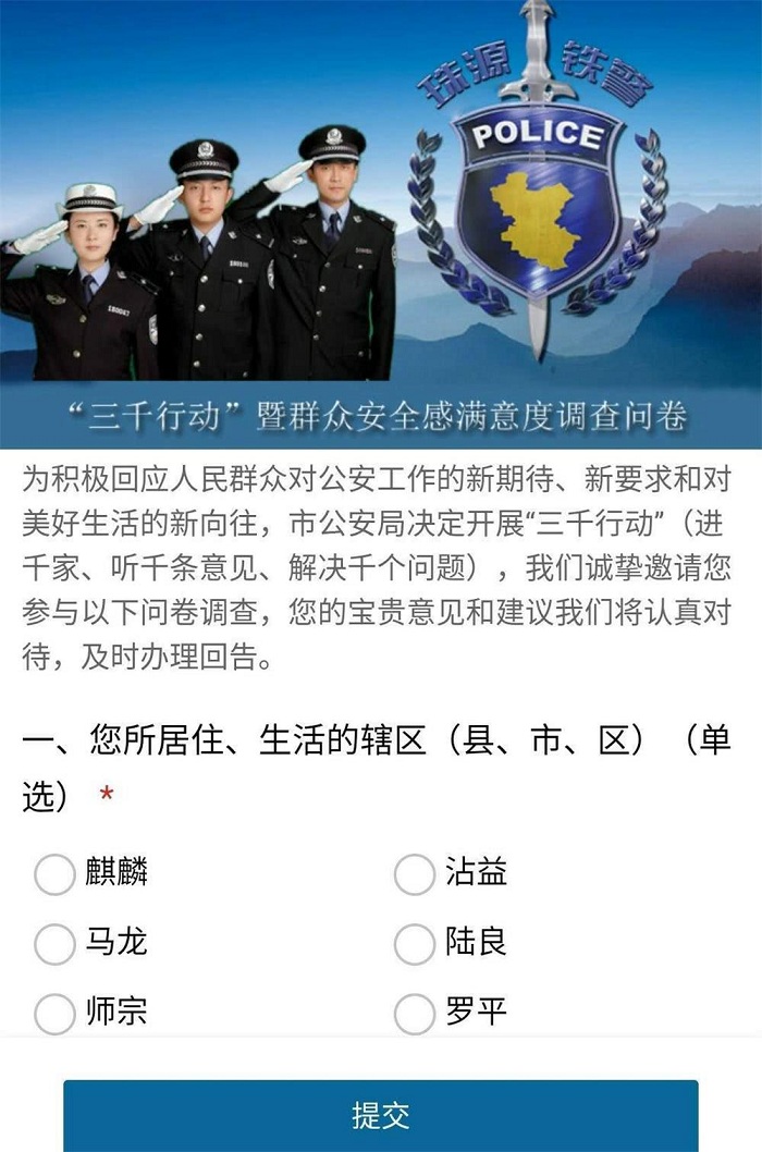 (三)开门征谏,畅通网上网下渠道。通过曲靖警方微信、微博公众号等平台,发布曲靖市公安机关“三千行动”暨群众安全感满意度调查问卷互联网链接,并要求各地各部门制作纸质调查问卷,网上网下同步、形式多样地组织全警开展调查走访和意见征集活动。全面拓展征集意见建议的思路、渠道和范围,畅通网上公安、网安、110指挥中心、纪检、督察、信访、法制等部门的网络、电话、来访渠道,受理涉警举报投诉问题,逐一见面核实,逐一研究办理,逐一落实回告。开展在侦案件回告、110警情回访,及时发现和改进工作短板。对反映纪律作风的问题,由驻局纪检组、督察部门负责落实,强化问题整改关键环节督察,对重大问题专项督办、处理和回告,对不落实或落实不力的及时跟进问责。工作中,既广开言路、畅通问题反映渠道,引导人民群众踊跃参与,又注意防止网络炒作、恶意投诉,依法处理不实消息和诬告陷害,保护民警正当权益。
