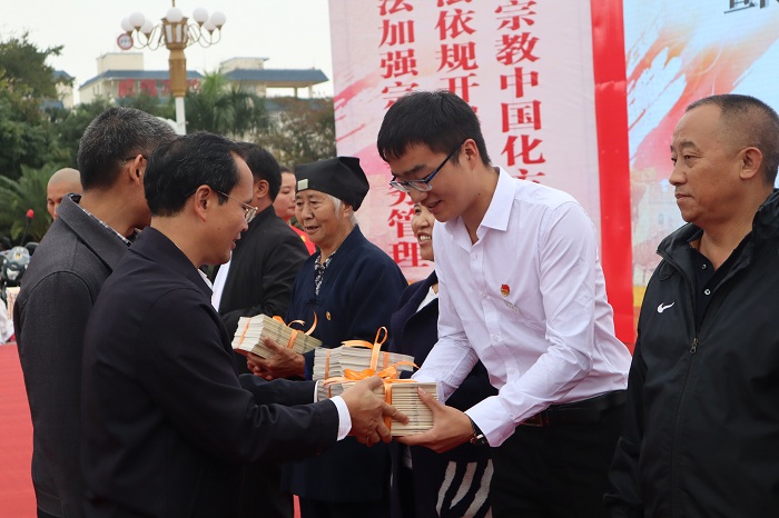 启动仪式开始前,文山学院25名青年志愿者冒雨到达活动现场,协助工作人员布置场地,引导观众入场,发放宣传册和座次表,维护现场秩序,确保活动有序开展。活动中,州委常委、州委统战部部长王毅作了重要讲话,并向各机关单位、高校、宗教团体代表赠送《宗教事务条例》法规书籍。启动仪式后,宗教法律知识现场问答比赛与网络答题竞赛同时进行,文山学院500余名同学兴致高昂,积极参与,认真学习了宗教政策法规,网络答题分数超过80分的同学,获得了购书券等小礼品。