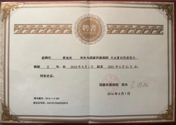(记者 钱丙申)日前,国家民族画院举行聘任仪式,云南籍旅美书法家樊端然从国家民族画院院长王林旭手中接过聘书,出任为期5年的国家民族画院书法篆刻院副院长一职。任职期间,樊端然将与国家民族画院的其他同仁一道为弘扬中国国粹艺术特别是西南诸省书法篆刻艺术尽职尽责。