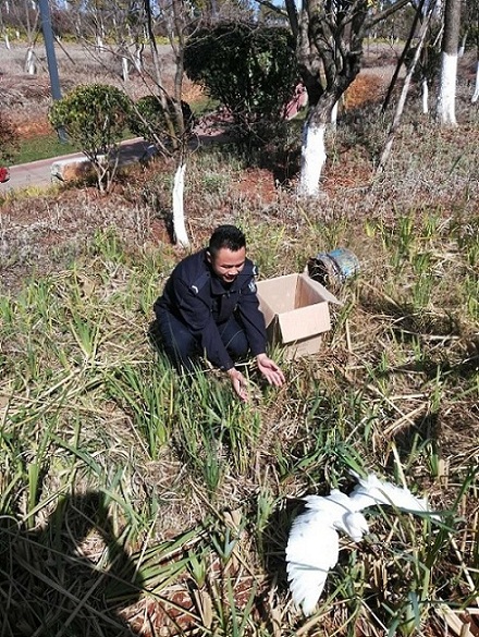接警后,局民警迅速赶到现场,在纸箱里看见一只白色大鸟,经民警鉴定,确定这只大鸟为白鹭,属三有保护动物。进行检查后,其生命体征完好,无外伤,具备野外生存能力,故民警将其带到宁湖湿地公园放归自然。