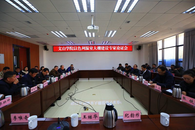 为促进文山学院应用型人才培养示范高校建设,加快设施农业及相关专业发展,根据《国务院办公厅关于深化产教融合的若干意见》[国办发〔2017〕95号]精神,通过政、校、企联合建设产业园区实现深化产教融合,促进教育链、人才链与产业链、创新链有机衔接,达到新形势下全面提高教育质量、扩大就业创业、推进经济转型升级、培育经济发展新动能的目的,1月6日,文山学院就以色列温室大棚建设项目在砚山召开专家论证会,对项目的可行性进行充分研究论证。会议邀请了云南农业大学教授纪韵祚、云南中医药大学教授黄衡宇、云南省农业科学院副院长王继华、中科院昆明植物所研究员李唯奇等专家,省农科院花卉所副所长李绅崇等合作单位负责人及文山州人民政府办公室副主任王带全、砚山县委副书记、县长杨元辉、副县长杨波等州、县相关领导出席论证会,文山学院党委书记熊荣元、校级领导、相关部门及二级学院负责人参加了会议,会议由文山学院党委副书记、院长李炳泽主持,会议推举了王继华任专家组组长。