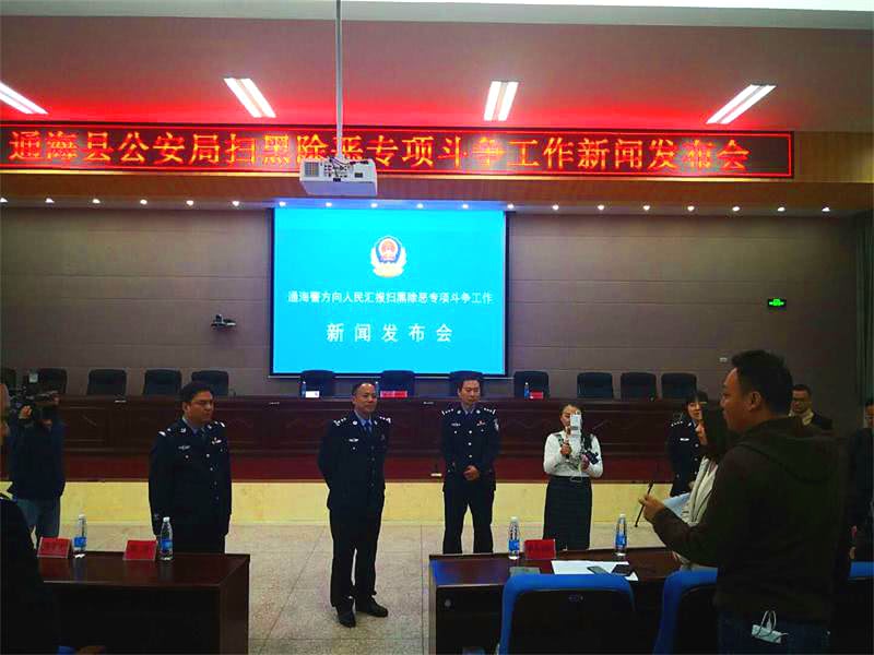 (记者 钱丙申 通讯员 姚锋)1月30日,通海县公安局扫黑除恶专项斗争新闻发布会。通报了 自中央、省、市、县党委政府部署开展扫黑除恶专项斗争以来,通海县公安局以新时代中国特色社会主义思想为指导,牢固树立“四个意识”,坚决做到“两个维护”,按照中央“对党忠诚、服务人民、执法公正、纪律严明”的总要求,迅速掀起了扫黑除恶专项斗争高潮,打掉了一批在通海寻衅滋事、敲诈勒索、横行乡里、欺压百姓的恶势力和村霸,在全县广大干部群众的努力和上级公安机关支持下取得了阶段性成效,全县社会治安状况得到明显改善。