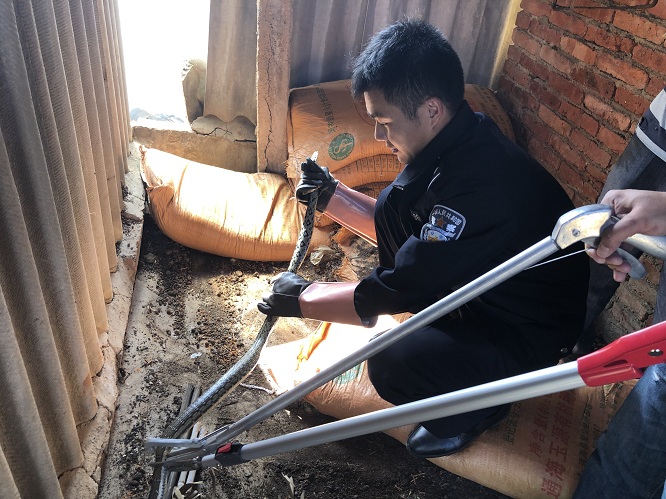 接警后晋宁区森林公安局值班民警立刻赶往报警地点,在报警人的指引下,民警在报警人堆放肥料的简易房里发现一条蛇蜷缩在肥料下面。因简易房空间较小且堆放的物品较多,民警将房内的肥料、杂物逐一清开后成功将蛇捕获。之后民警对报警人简易房周边进行安全排患后将蛇带离。
