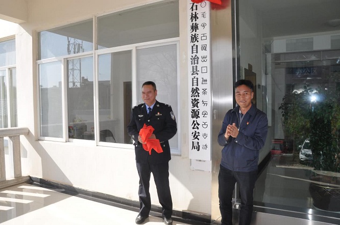 揭牌仪式由石林县人民政府办副主任昂剑峰主持,李雄彬副县长、县公安局副局长李润桥、县林业和草原局局长姬卫国、县自然资源公安局普光富局长为“石林彝族自治县自然资源公安局”、“石林彝族自治县公安局自然资源大队”揭牌。