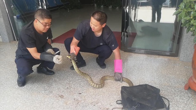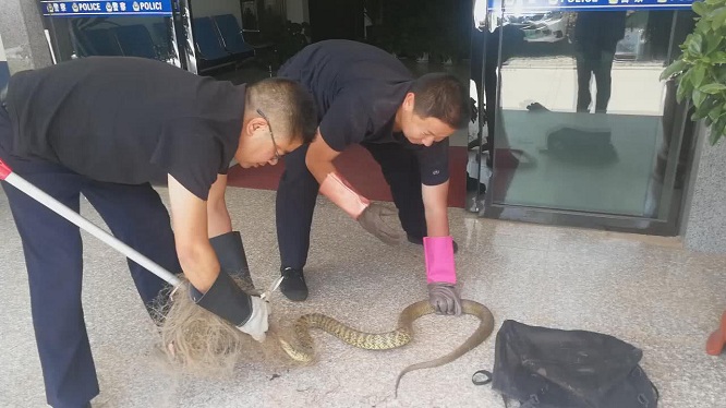 经检查,该蛇为均为本地常见的黑眉锦蛇,长约1.6米,重约3公斤。其身体状况良好,为让其更好的生活,民警于当日将其放归大自然。