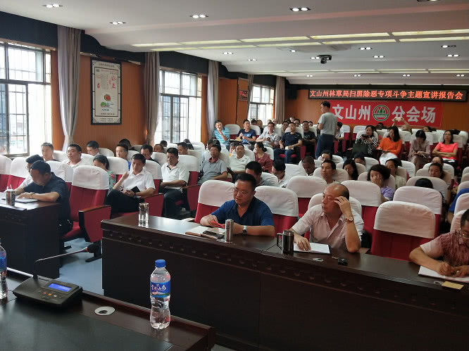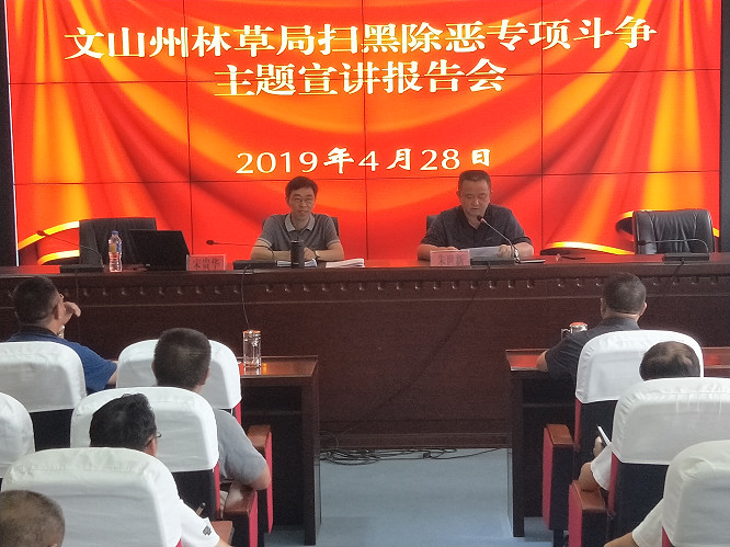 (记者 钱丙申)4月28日,文山州林草局召开扫黑除恶专项斗争主题宣讲报告会,会议邀请州扫黑除恶专项斗争主题宣讲团成员、州人民检察院副检察长宋贵华作“切除社会毒瘤,净化社会坏境,为实现党的十九大提出的目标任务提供保障”主题宣讲,宋贵华检察长围绕中央领导关于开展扫黑除恶专项斗争的重要指示精神,扫黑除恶专项斗争的背景和意义,省州各级党委政府开展扫黑除恶专项斗争的安排部署、工作要求、各阶段目标任务,以及相关典型案例进行了宣讲。