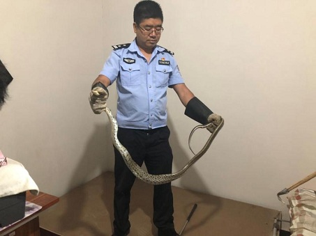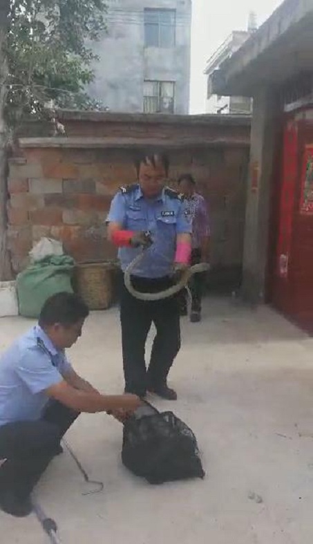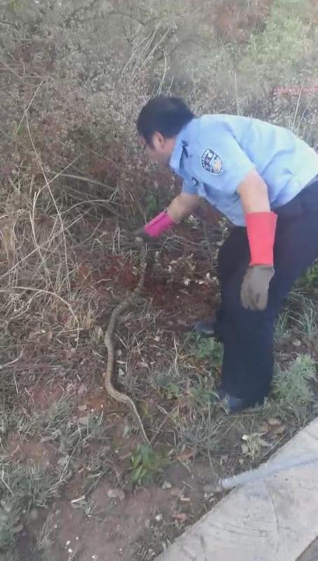 接报后,晋宁区自然资源公安局值班民警立即赶往报警地点。在晋城镇小寨村,报警人称其家中有一条大蛇,她不敢进家了。后民警在报警人的指引下,在其家中厨房里找到了报警人所说的蛇。因厨房内杂物较多,民警将房内的物品清开后将蛇捕捉。在昆阳磷肥厂旁一工房,报警人称蛇在其床下,民警将其床上的铺盖、蚊帐等物品移开后将蛇捉住。后民警对报警地点附近进行安全排患后将蛇带离。